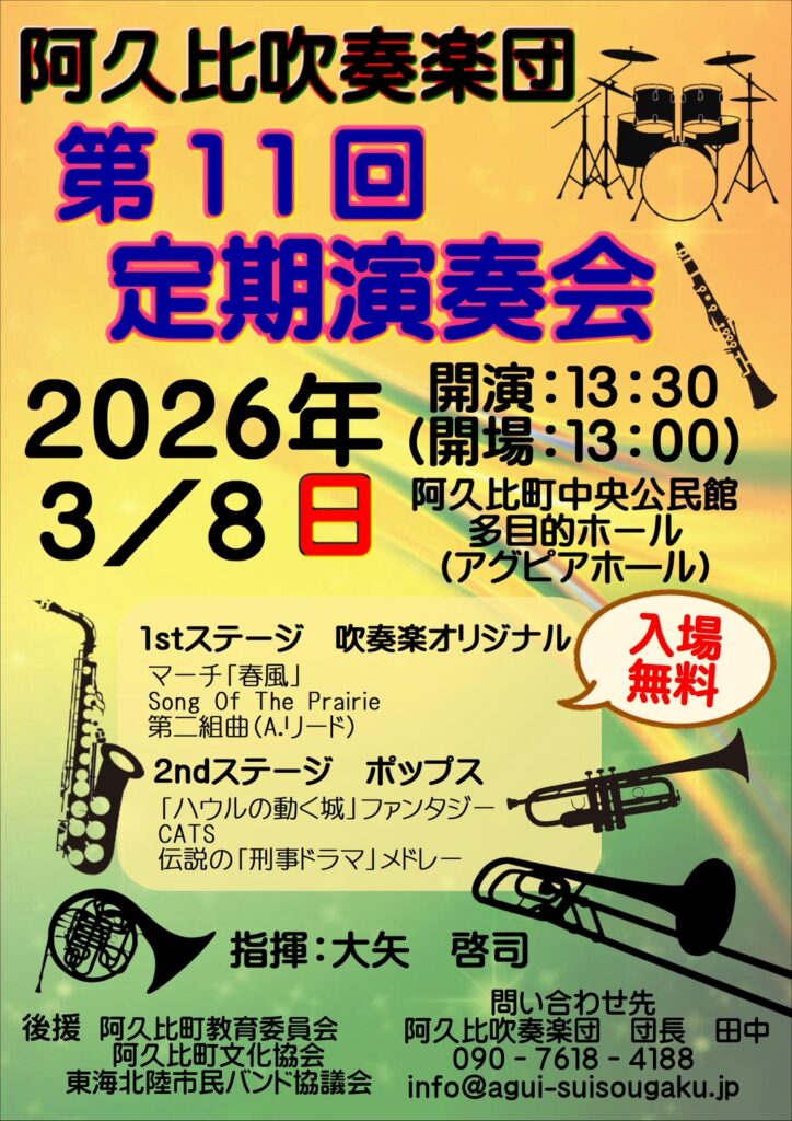 2026年3月8日(日)                               第11回定期演奏会                               会場 : 阿久比町中央公民館多目的ホール(アグピアホール)                          開場 : 13:00                                 開演 : 13:30~                               入場料金 無料